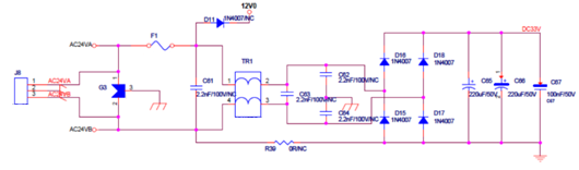 2: 针对此AC24V电源方案,由于其采用了DC-DC芯片转换,所以整流桥负极性的地与后极数字地是必须相连的,这与FlyBack电路不同,所以其防护设计需要特别考虑从数字地通过整流桥到接口的路径。