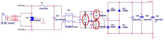 更改电路,由于原PCB空间限制,实际电路选用了suncitygroup太阳新城BV-SMBJ58C2H,SMB封装,功率达到3000W,相当于BV-SMDJ58CA。测试雷击AC24V电源口AC24VA测试通过,AC24VB测试后设备损坏,详细检查电路后发现整流桥二极管烧毁。