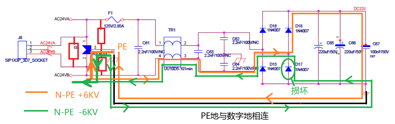 如上图黄色所示为N-PE +6KV测试时的能量流经图,大能量从AV24VB开始大部分通过TVS管泄放到地,另一部分能量通过后极整流桥D18通过DC33V与地的电容流经,由于电容隔离在,因此后极泄放的能量很小,不至于把整流桥搞坏。测试结果为通过。