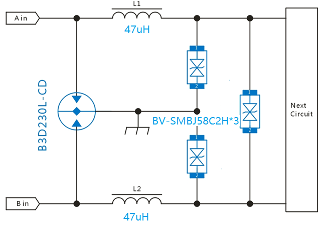 共模电感后极增加TVS管做二级保护,TVS选型可以用BV-SMCJ58CA,BV-SMDJ58CA,BV-5SMDJ58CA,实际选用功率大小与PTC、共模电感退耦有关系。