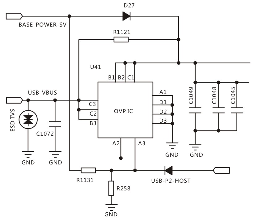 产品电路图如下(原电路图),该USB接口输入端有三级防护,初级是一个ESD类的防护器件,后级还有一个OVP防护器件,两级之间没有做退耦器件。查相关规格书,OVP的通流较小,为5A。前级ESD通流相对较大点,为100W,折算成8/20μs的电流,约为13A左右。