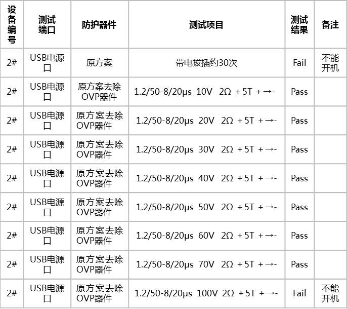 某客户的智能手持式POS机,使用的是USB口作为整机的电源输入口,在使用过程中,经过数次带电拔插,设备就不能开机了,电源输入异常。拆机,测量USB电源两端为短路,查出为OVP芯片短路所致。由于去除了OVP器件,客户担心实际使用过程中会存在应用风险。故,提出EOS满足200V的测试要求。