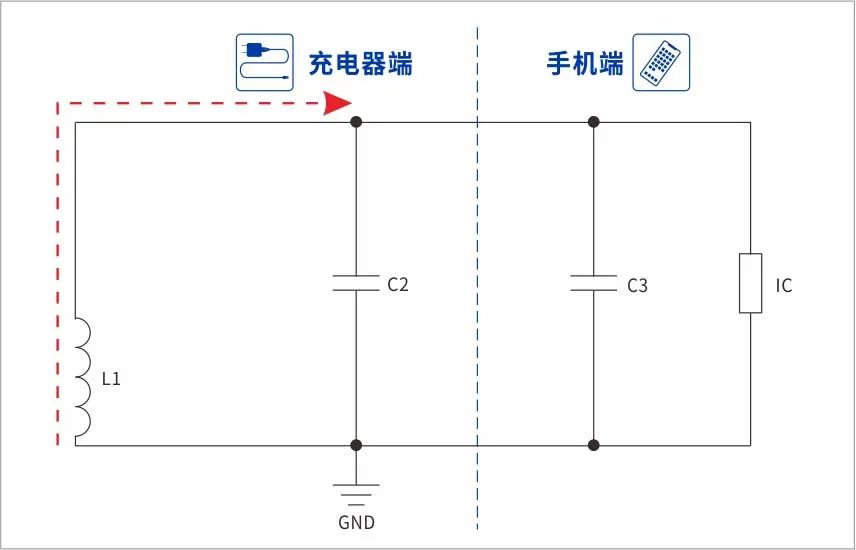 如上图,总会存在一些断开充电的瞬间,漏感L1给C2、C3充电,除此之外,充电端到手机端整个充电回路其实也有电感存在。总之我们都可以把他看着是L1 。